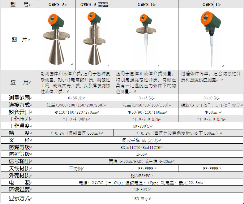 GWRS型雷達(dá)物位計(jì)因其特殊的非接觸式測(cè)量特性,可對(duì)有污染性和腐蝕性的介質(zhì)進(jìn)行準(zhǔn)確的測(cè)量,其穩(wěn)定和準(zhǔn)確的表現(xiàn)也同樣體現(xiàn)在復(fù)雜的測(cè)量環(huán)境下。輸出的4~20mA信號(hào)可以提供遠(yuǎn)端控制,采用了獨(dú)特的微波技術(shù)和Echo-tech回波處理技術(shù)以適應(yīng)各種工況。脈沖的工作方式可測(cè)小介電常數(shù)介質(zhì),并安全適用于各種金屬,非金屬容器內(nèi),對(duì)人體及環(huán)境無(wú)傷害。